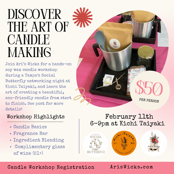 Join Ari’s Wicks for a hands-on soy wax candle workshop during a Tampa’s Social Butterfly networking night at Kichi Taiyaki, and learn the art of creating a beautiful, eco-friendly candle from start to finish.